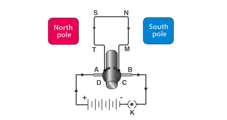 When current is made to flow through the coil MNST by closing the switch, the coil starts to rotate in the anticlockwise direction. This is due to the downward force acting on the length MN and simultaneously an upward force acting along the length ST. As a result of which the coil rotates in the anticlockwise direction. Current in the length MN flows from M to N and the magnetic fields act from left to right normal to the length MN. According to Fleming’s Left Hand rule, a downward force acts along the length MN.