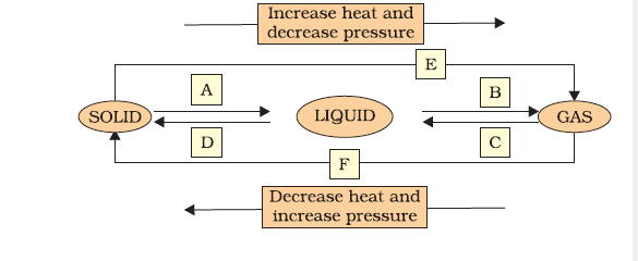 Q9. Name A, B, C, D, E and F in the following diagram showing a change in its state.