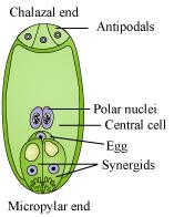 The first mitotic division in the megaspore forms two nuclei. One nucleus moves towards the micropylar end while the other nucleus moves towards the chalazal end. Then, these nuclei divide at their respective ends and re-divide to form eight nucleate stages. As a result, there are four nuclei each at both the ends i.e., at the micropylar and the chalazal end in the embryo sac. At the micropylar end, out of the four nuclei only three differentiate into two synergids and one egg cell. Together they are known as the egg apparatus. Similarly, at the chalazal end, three out of four nuclei differentiates as antipodal cells. The remaining two cells (of the micropylar and the chalazal end) move towards the centre and are known as the polar nuclei, which are situated in a large central cell. Hence, at maturity, the female gametophyte appears as a 7-celled structure, though it has 8 nucleate.