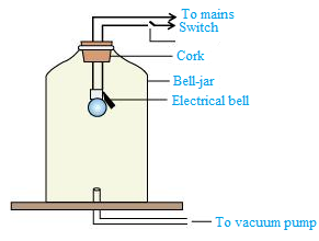 Answer: Take an electric bell and hang it inside an empty bell-jar which is fitted with a vacuum pump (as shown in the figure below).