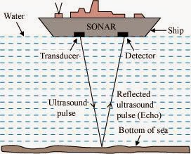 A beam of ultrasonic sound is produced and transmitted by the transducer (it is a device that produces ultrasonic sound) of the SONAR, which travels through sea water. The echo produced by the reflection of this ultrasonic sound is detected and recorded by the detector, which is converted into electrical signals. The distance (d) of the under-water object is calculated from the time (t) taken by the echo to return with speed (v) is given by 2d = v × t. This method of measuring distance is also known as ‘echo-ranging’.
