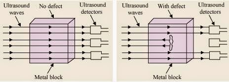 The cracks or holes inside the metal blocks that are invisible from outside reduce the strength of the structure. Ultrasonic waves are allowed to pass through the metal block and detectors are used to detect the transmitted waves.