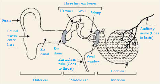 Various sounds produced by particles in our surroundings are collected by pinna that transfers these sounds to the ear drum through the ear canal. The eardrum begins to vibrate back and forth briskly as soon as the sound waves fall on it. The vibrating eardrum initiates the small bone hammer to vibrate. These vibrations are passed from the hammer to the third bone stirrup via the second bone anvil. The stirrup strikes the membrane of the oval window to pass its vibration to the cochlea. The liquid in the cochlea produces electrical impulses in the nerve cells. These electrical impulses are carried to the brain by the auditory nerve. They are interpreted by the brain as sound and hence we get a sensation of hearing.