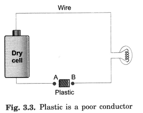 If we place a piece of copper in the gap touching points A and B (in Fig. 3.3), we observe that bulb glow. If we place plastic in the gap between A and B, we observe that the bulb will not glow. It means plastic is a poor conductor.